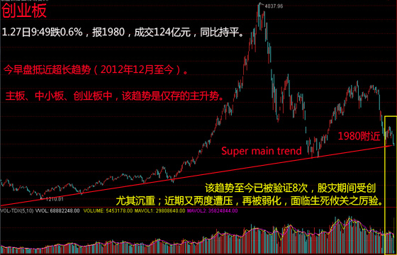 10:06,创业板跌1.02%,报1981,再度轻微击穿长期主趋势。