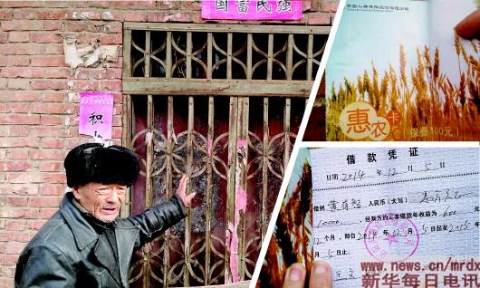 左图:一位村民指着农信社河村乡黄村的代办点。韩秋云在被撤销农信社代办员身份后,依然在此处为大家“办公”。右上图:韩秋云给村民们办的“存单”,表面上看是一张中国人寿的保险单,但其面额只有100元。右下图:保单内夹着的公司借款票据。本报记者王学良摄