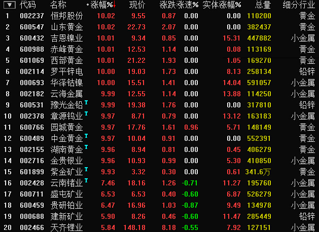 截止到上午收盘,有色板块低开高走,截至发稿,板块整体涨幅超过1%,领涨两市行业板块。黄金概念板块涨6.14%全线爆发,其中,8股率先涨停,包括恒邦股份、山东黄金、赤峰黄金、西部黄金、豫光金铅、中金黄金、湖南黄金和紫金矿业等多股涨停。