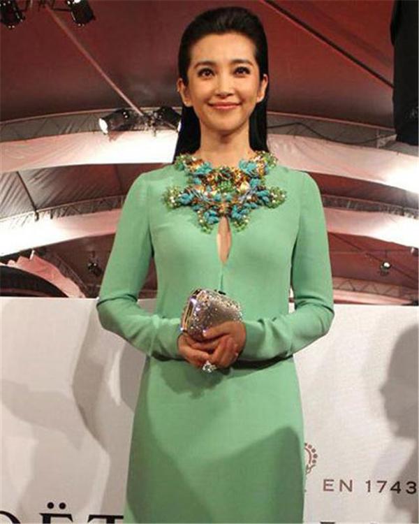 一袭苹果绿长袖礼服,搭配由玉、黄水晶和绿松石组成项链装饰,映衬出白皙精致的妆容,优雅大气又不失庄重。