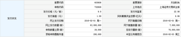 广州天创时尚鞋业股份有限公司7000万股A股股票将于2月18日在上交所上市交易,证券简称为“天创时尚”,证券代码为“603608”。该公司A股股本为28000万股。
