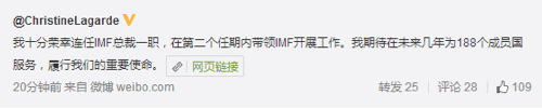 今日,拉加德的官方账号也发布了微博:“我十分荣幸连任IMF总裁一职,在第二个任期内带领IMF开展工作。我期待在未来几年为188个成员国服务,履行我们的重要使命。“