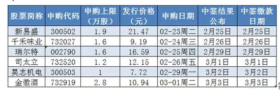 按照发行安排,新易盛、千禾味业、瑞尔特、司太立、昊志机电、金徽酒6只新股从周二起陆续申购。