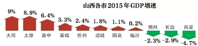 新京报记者从当地人士手中得到的一份山西省的统计快报显示,2015年山西11个地级市的GDP增速呈现两极分化状态,其中既有大同和太原以9%和8.9%的高增速领跑全省,也有吕梁、长治和朔州三市出现了负增长。其中吕梁曾连续十年领跑山西省GDP,因为煤炭市场的萧条,经济增速排名垫底全省。