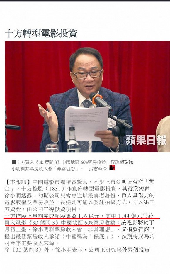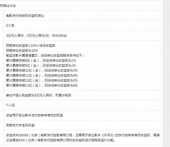 根据此前《中国经营报》的报道,这部电影在2014年筹拍阶段,就曾通过P2P等方式募集了大量资金,2015年又曾通过苏宁众筹等多个P2P平台募集发行资金,影片上映前夕,A股上市公司神开股份、港股上市公司十方控股相继认购了《叶问3》票房收益权的理财产品。
