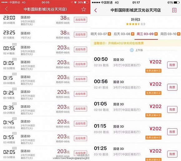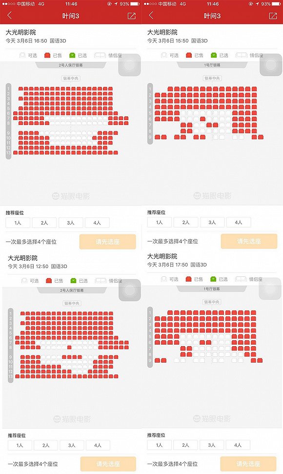 在电影行业,“包场放映”其实是颇为常见的做法,但《叶问3》不同,大量包场并不会真的有观众前往观看,有些影院出现“虚假排场”“幽灵场”,并且动辄200多元的高票价,在线选座网站的公开数据也显示,一些位置并不好的座位却比黄金位置卖的更快。