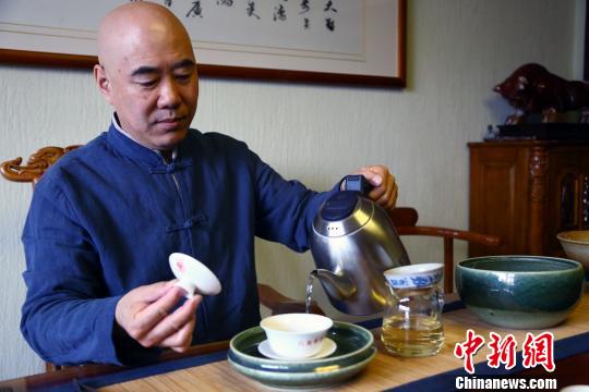祖籍山东的丁利民,是在青海长大的“援青二代”,退休后在青海省会西宁经营有一间不大的茶室,取名醇臻“致力打造”适合高原大众消费的茶品体验店。图为“老茶泡儿”丁利民正在洗茶。 罗云鹏 摄