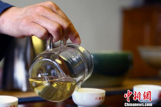丁利民眼里,30多年来青海人的喝茶习惯也从原先熬茶或者盖碗茶开始逐渐多元化,品质化。图为丁利民正在“测试”茶汤颜色。 罗云鹏 摄