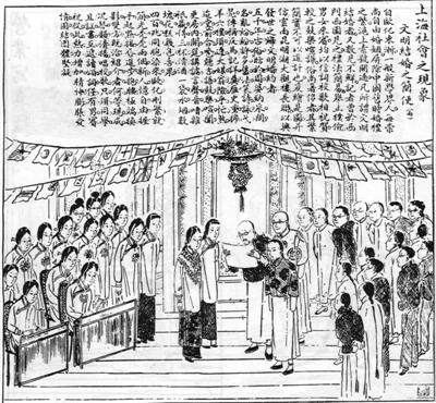夏晓虹:1905年1月2日在上海张园举办的廉隅与姚女士的婚礼首开文明结婚先河,被《女子世界》主编丁初我推为“创新结婚”之先声。张园是上海小有名气的公共空间。当时上海的公家花园是由西方人开办的,不允许中国人进入。张园原本是一个私人花园,后向中国人开放,因此变为一个公众场所。园中既有西式建筑,又有中式园林,很多集会、政治活动都会选择在那里进行。中国女学堂的筹备大会也曾借用那块场地。因其中西合璧的风格契合了新式婚礼的意涵,不少接受新式教育的新人会选择在那里举办婚礼。标准的“文明结婚”婚礼分为“行结婚礼”“行见家族礼”和“行受贺礼”三个环节,以及结婚双方交换戒指一类饰物、宾主鞠躬致敬、小辈献花为贺、来宾致辞与新人答词。当时举办新式婚礼的新人多半是新学堂的学生。在婚礼上也会唱类似由金天翮填词的《自由结婚歌》这类歌曲。