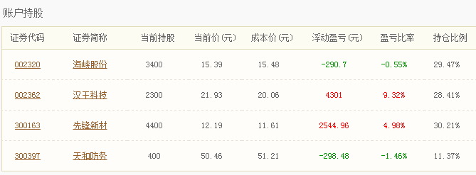 两位选手今日秉持多看少动的原则并未调仓,“秋雨落叶花”持仓的海峡股份、先锋新材逆势飘红,海峡股份逆势上涨3.5%,“红色的火焰8” 重仓的安诺其逆势涨停,分析认为,大盘反弹难以持续再现跳水调整,或预示空头力量依旧较强,建议投资者谨慎调仓。 ![]()