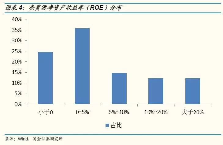 根据净资产收益率(ROE)指标来看,目前全部A股的ROE为3.1%,而将近一半的壳公司ROE低于全部A股的平均ROE,其中有25%的壳公司净资产收益率为负值。因此,从盈利能力来看,壳资源的整体盈利能力要弱于A股平均,由于壳资源盈利能力较弱,因而其卖壳的意愿要更强。