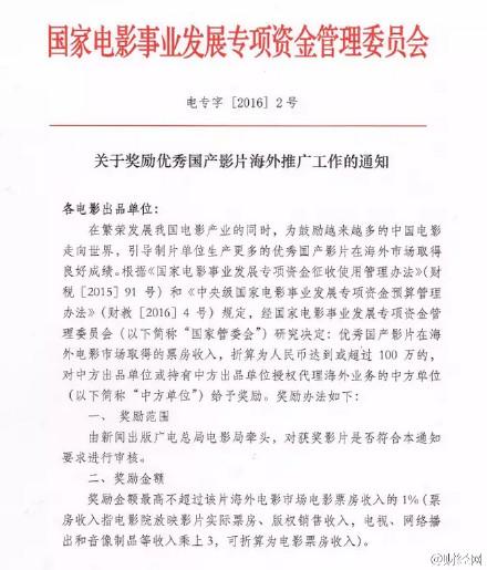 凤凰财经3月16日讯 从国家电影资金办获悉,为鼓励更多的中国电影走向世界,国家电影事业发展专项资金管理委员会决定,对在海外市场票房收入达到100万元以上的国产电影给予奖励。