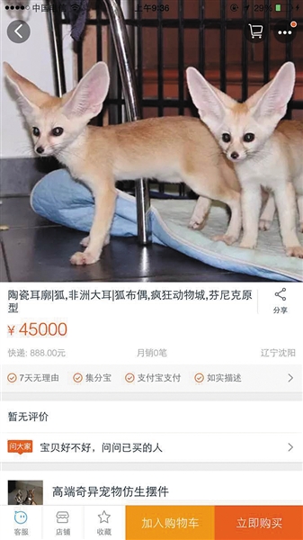 昨日上午,某网络购物平台一家网店标出“疯狂动物城芬尼克”原型,非洲大耳,45000元。网络截图