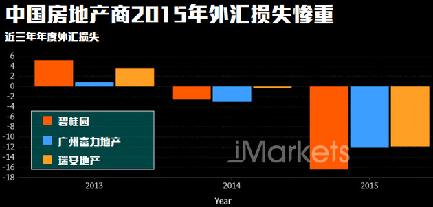 彭博汇总数据显示,市值超过100亿人民币的70家大型中国房企中,目前已公布2015年年报的企业不足三分之一,累计报告汇兑损失已达63亿元。上述70家公司2014的全部外汇损失仅12.7亿元。人民币去年兑美元贬值4.46%,使收入主要来自中国大陆但大量使用低息美元融资的企业损失惨重。