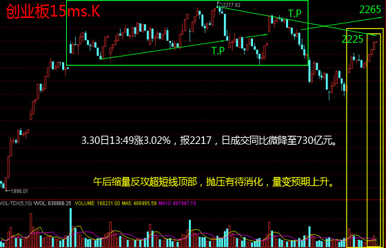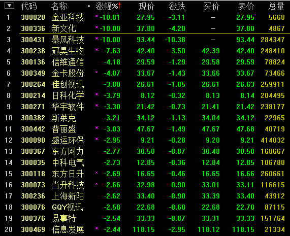 14:09,创业板翻绿跌0.14%,报2245,成交同比增至1065亿元,达天量级。各板块散漫回落,金亚科技和暴风科技维持跌停。
