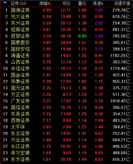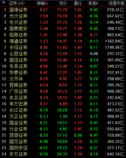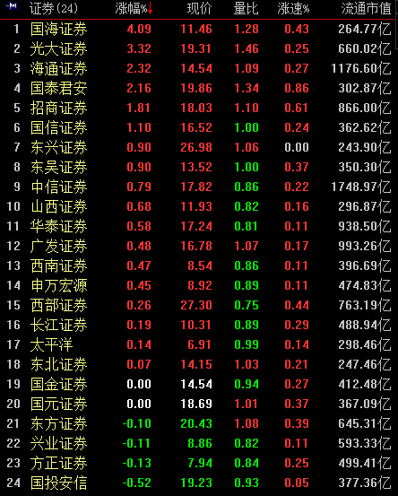 13:19,午后券商快速拉升,现涨0.8%,成交同比降至162亿元。国海证券、国泰居安、光大证券相对放量领涨。
