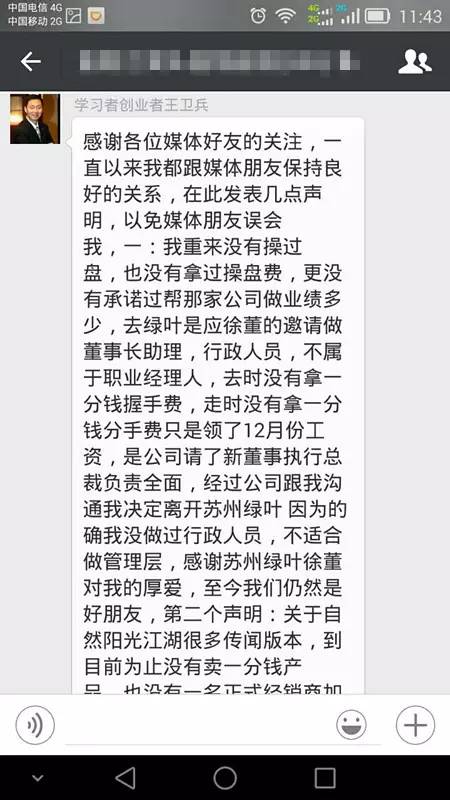 此外,在报道中提到的王卫兵先生原效力于苏州绿叶。有人调侃王先生在绿叶操盘时拿了钱却没做出什么业绩。而王先生也就此番言论做出了回应,称其在绿叶并非操盘手,也并未正式加入自然阳光,只是接触过。