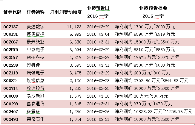 麦达数字、英唐智控、景兴纸业、中京电子、雷柏科技、奥特佳、康强电子、旋极信息、牧原股份、易成新能、富春通信、多氟多、荣盛石化13只个股预增幅度超过10倍。