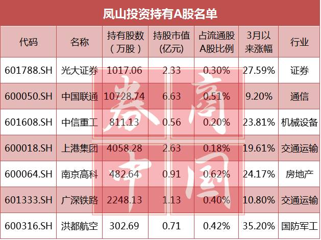 而凤山投资已经入中国联通、上港集团、光大证券、广深铁路、南京高科、洪都航空、中信重工前十大流通股东,分别持有市值6.63亿元、2.63亿元、2.33亿元、1.13亿元、0.91亿元、0.71亿元、0.56亿元。