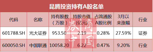 坤藤投资共进入两家上市公司前十大流通股东,分别为中国联通和光大证券,持有市值分别为6.22亿元和2.19亿元。