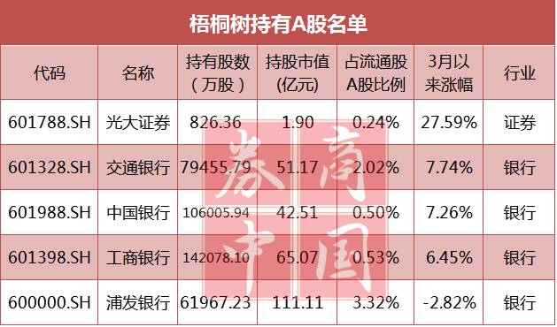 据上市公司年报,梧桐树投资已经入浦发银行、工商银行、交通银行、中国银行、光大证券前十大流通股东,持有市值分别达到111.11亿元、65.07亿元、51.17亿元、42.51亿元和1.9亿元。
