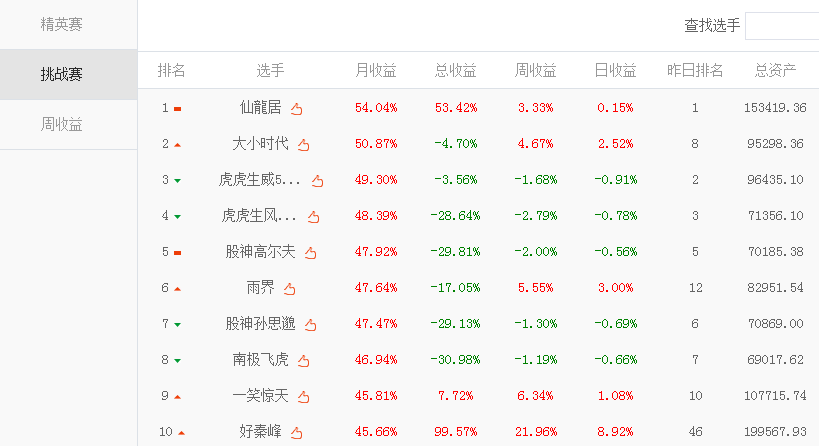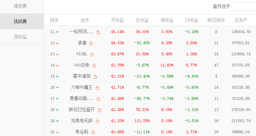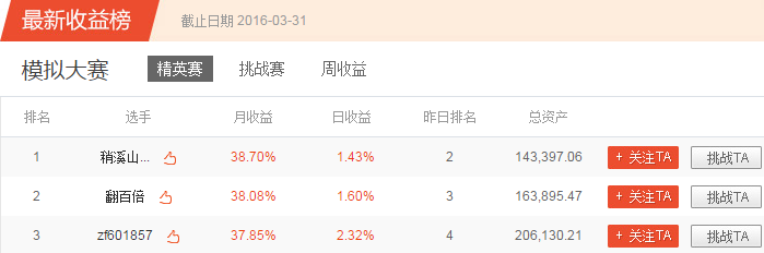 凤凰财经讯 第四届凤凰炒股大赛3月赛结束,获奖名单已经正式产生。用户名为“稍溪山许家人”的选手获得精英赛第一名,“翻百倍”和“zf601857”分列精英赛第二和第三,挑战赛“仙龍居”获得挑战赛第一名,“大小时代”和“虎虎生威500万”获得第二和第三名。
