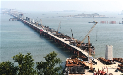 建设中的平潭海峡公铁两用跨海大桥。福平铁路平潭海峡公铁两用跨海大桥起于福建省长乐市松下镇,全长16.34公里,经过四座岛屿后到达平潭岛。该桥上层是六车道高速公路,下层可供动车组列车行驶。预计2019年建成通车。新华社记者 林善传 摄