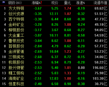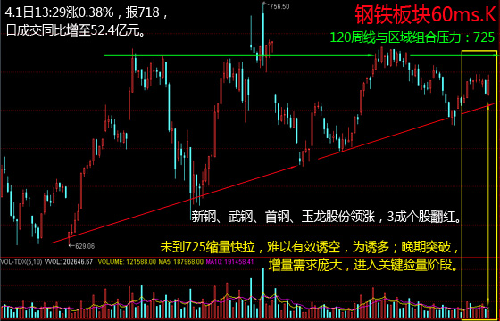 13:31,钢铁板块跌0.84%,报724,成交同比降至62亿元。4月1日午后反弹以来,暂无有效放量配合突破725点压力。方大特钢、西宁特钢领跌,8成个股下跌,新股赛福天延续一字涨停;永兴特钢、抚顺特钢等少数个股上涨。