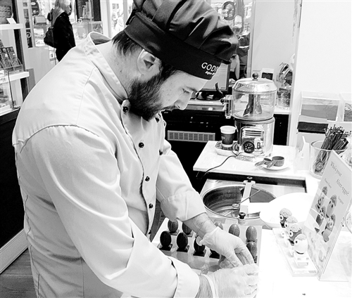 手工作坊式的巧克力制作是比利时巧克力生产的一大特色。图为比利时巧克力大师正在手工制作巧克力。 经济日报记者 严恒元摄
