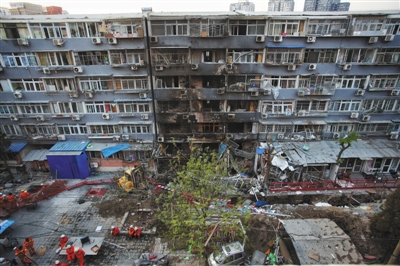 昨日,海淀区红联南村小区,救援人员在火灾现场排查。当日13时15分许,该小区发生燃气爆燃,引发居民楼起火。小区居民张女士说,听到爆炸声10多分钟后,火越烧越大,蹿到了5楼高。北京消防官方微博发布消息称,现场为施工工地挖断燃气管道,造成爆燃。消防到场后迅速破拆房门,深入火场内部开展内攻,同时逐户搜救疏散被困人员。14时36分,明火被扑灭,过火面积300平方米。扑救过程中,共救出8人,其中1人死亡,2人轻伤,另疏散160余人。新京报记者 彭子洋 摄