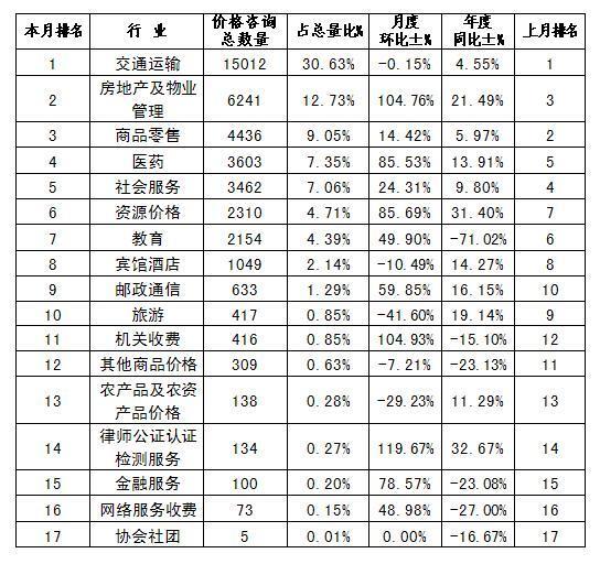 价格咨询数量排名前五位的行业分别是:交通运输(15012件)、房地产及物业管理(6241件)、商品零售(4436件)、医药(3603件)、社会服务(3462件)。占比分别为:30.63%、12.73%、9.05%、7.35%、7.06%(详见附表4)。