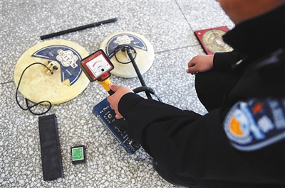 民警展示盗墓团伙使用的金属探测仪。图/新华社