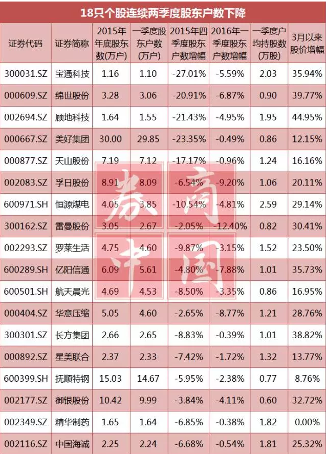 值得关注的是,从去年四季度开始,两市有18只个股的股东户数已连续两季度下降。其中,以一季度的降幅来看,雷曼股份、孚日股份、华意压缩和亿阳信通的股东户数在一季度环比下降了12.40%、9.20%、8.77%和7.88%,均位居数据前列。则这些个股3月以来的平均涨幅为25.16%。