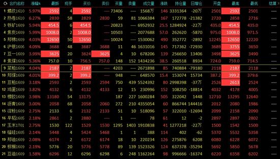 焦煤涨5.08%,菜粕涨3.95%、橡胶涨3.91%,白银涨3.84%、鸡蛋涨3.69%、大豆涨3.59%、动煤涨3.23%,豆粕、淀粉、玉米、沥青、棕榈等涨超2%。