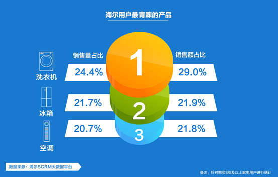 针对购买3类及以上家电用户进行统计发现,洗衣机、冰箱、空调为海尔用户最青睐的产品。其中,海尔网器每年出货量增速287%,通过产品绑定优家APP的数量也以2225%的速度增长,这表明海尔在智能家居领域快速增长。