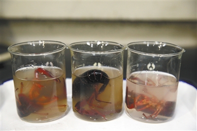 三份小龙虾样本经过超声波清洗后,溶液均不同程度浑浊。