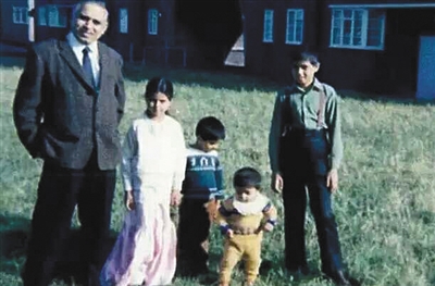 萨迪克汗(最小的孩子)和他的父亲及哥哥姐姐,站在政府提供的廉租房前。
