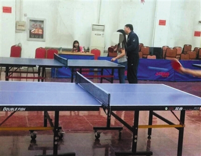 王欢拍摄的男教师指导女学生打乒乓球时的样子。