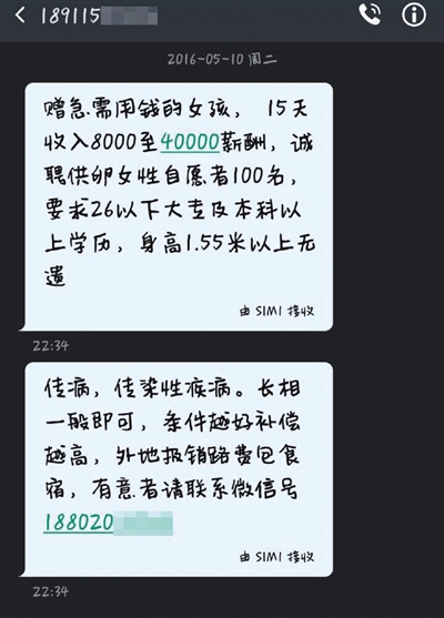 “诚聘供卵女性自愿者,15天收入8000至40000薪酬。”近日,北京理工大学良乡校区多名学生收到“征卵子”的短信。