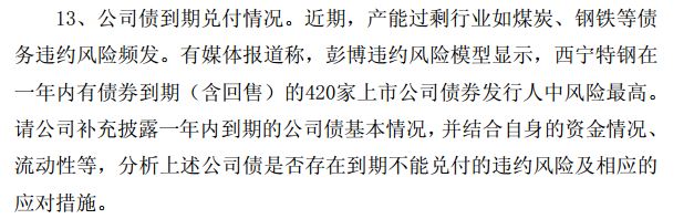 凤凰财经讯 5月23日,西宁特钢表示,上交所向公司发出问询函,要求就公司债到期兑付风险及其他有关其经营状况的问题,在5月24日(周二)前予以答复。