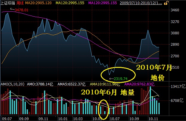 2009年8月4日,A股经历了9个月的短暂牛市后,上证指数在3478点见顶,就在几个交易日前的2009年7月29日,上证指数成交额达到2969.26亿元,也是此轮小牛市的峰值。随后A股经过近一年的震荡下跌,在2010年7月2日见到阶段低点2319.74点,成交量萎缩至430亿元,这一成交量仅为前期峰值(2969.26亿元)的七分之一左右。随后A股自2319.74点持续反弹了四个月,于2010年11月11日见顶3186.72点,此时上证成交量最高冲至3065.09亿元。