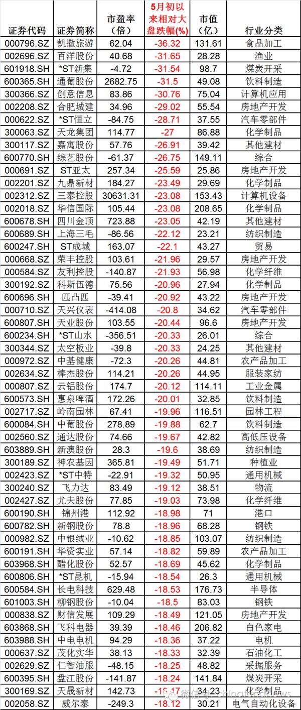 【这些个股严重跑输大盘 重仓基金损失惨重(附表)】5月以来市场行情颇为尴尬,漫漫熊途之中,市场泥沙俱下,不少个股的股价股价狂泻,相比主要股指的跌幅超过30%,而这些个股主要分为两类,重组失败个股和ST概念股。