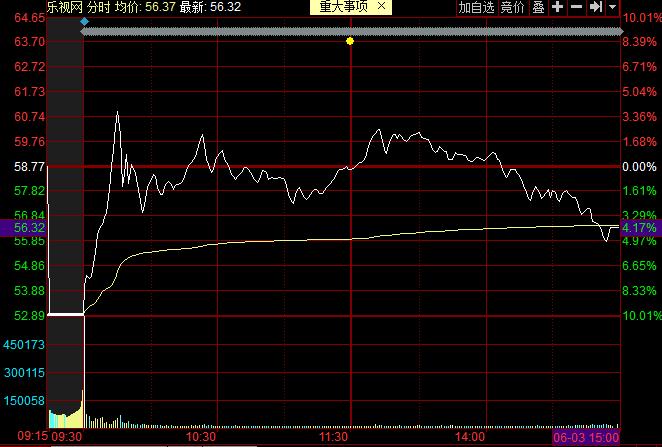 高位停牌的乐视网难以避免的在复牌首日遭到补跌。截止收盘,乐视网股价报56.32元,跌幅4.17%。日换手20.08%,盘中振幅达13.77%,成交量217万手,成交额122亿元创下历史新高。今日早盘,乐视网开盘即报跌停,开盘后股价迅速拉升,最高涨至60.98元,涨幅达3.76%。随后股价起伏,尾盘持续下跌,最终报收于56.32元,跌幅为4.17%。