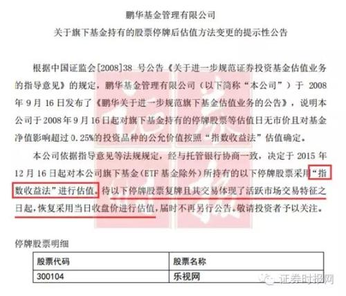 公告指出,相关基金所持有的乐视网股票份额采用“指数收益法”【这个参考指数为AMAC信息(H11044)】进行估算,待股票复牌后,再恢复用当日收盘价进行估算。