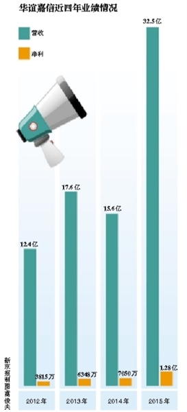 事实上,通过频繁并购,华谊嘉信近年来业绩大幅拉升。在其上市的2010年,公司营收为5.56亿元,利润总额3350万元。但在2015年,其营收达到32.5亿元,同时,净利润也攀升至1.28亿元。