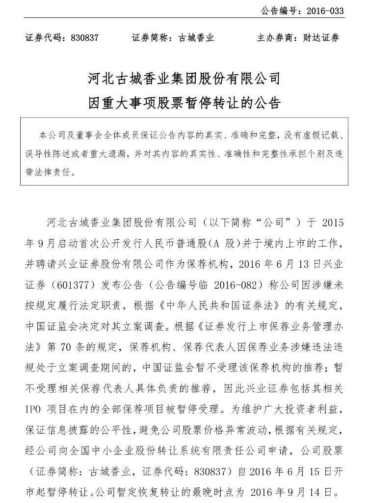 受兴业证券被立案调查的牵连,6月14日,拟IPO的新三板挂牌公司古城香业收盘暴跌15.7%,每股6.71元。今日晚些时候,古城香业发布因重大事项股票暂停转让的公告。