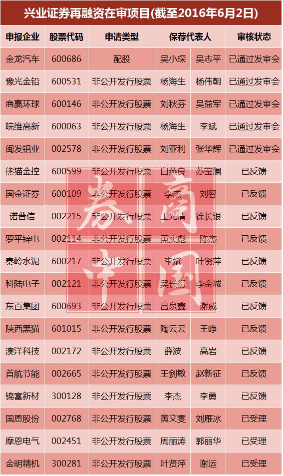 再融资方面,兴业证券也有19个在会项目。据证监会公布的再融资申请企业情况中,截止6月2日,兴业证券承揽的非公开发行股票,已通过证监会审核的项目4个,已反馈意见的11个,报会受理的3个,共计18个。此外,还有一个已过会的配股项目。