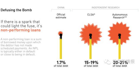 中国不良贷款率预测:官方预测1.7%,法国里昂证券15-19%,Autonomous研究20-21%。
