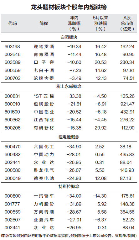 白酒股方面,口子窖、青青稞酒、迎驾贡酒等个股年内跌幅超过10%,伊力特、今世缘、沱牌舍得、老白干酒等个股也逆板块下跌。稀土永磁概念,*ST五稀、包钢股份、中国铝业等个股年内跌幅超过20%,江西铜业、有研新材、西藏发展等个股跌幅超过10%。锂电池概念,六国化工、中国动力、众业达、卧龙电气等个股跌幅超过25%。特斯拉概念,一汽轿车、力帆股份等个股跌幅超过30%,万向钱潮、亚夏汽车、众业达、卧龙电气等个股跌幅超过25%。OLED概念,巨化股份大跌57.25%位居跌幅榜首位,隆华节能、锦富新材、诚志股份等个股跌幅超过30%。