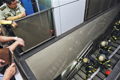 昨日凌晨,地铁宋家庄站,消防员前往解救“伤员”。当天,宋家庄地铁站举行消防演习,全国所有有地铁城市的消防相关人员前来观摩。